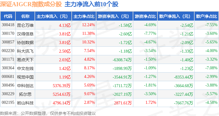 资金流向方面,深证AIGCR(470075)指数成份股当日主力资金净流入合计8.89亿元,游资资金净流出合计4.55亿元,散户资金净流出合计4.34亿元。成份股资金流向详情见下表: