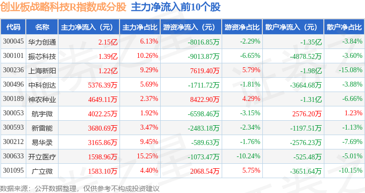 资金流向方面,创业板战略科技R(471004)指数成份股当日主力资金净流出合计17.95亿元,游资资金净流入合计5.1亿元,散户资金净流入合计12.85亿元。成份股资金流向详情见下表: