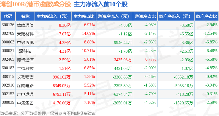 资金流向方面,湾创100R(港币)(480002)指数成份股当日主力资金净流出合计61.08亿元,游资资金净流入合计14.84亿元,散户资金净流入合计46.24亿元。成份股资金流向详情见下表: