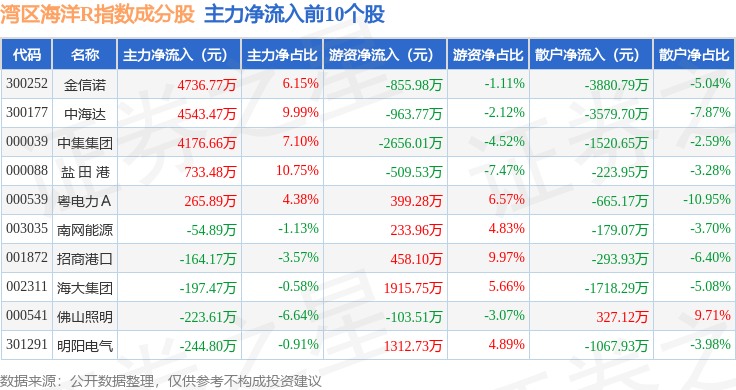 资金流向方面,湾区海洋R(480019)指数成份股当日主力资金净流出合计1118.56万元,游资资金净流出合计8029.51万元,散户资金净流入合计9148.06万元。成份股资金流向详情见下表:
