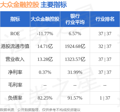 大众金融控股港股市值14.71亿港元,在银行行业中排名第32。主要指标见下表:
