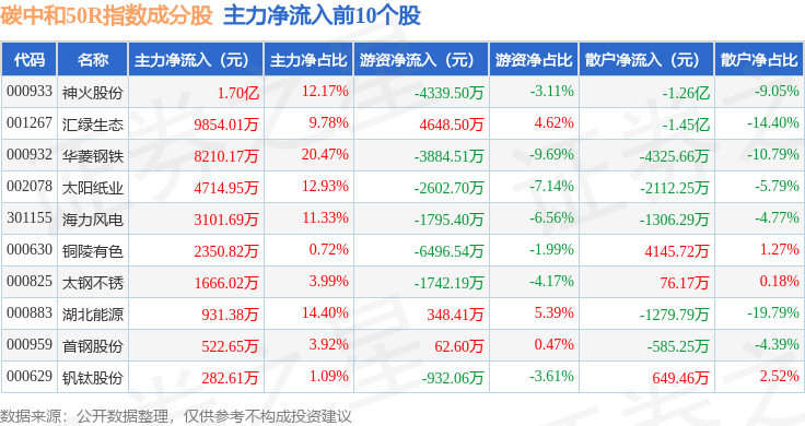 资金流向方面,碳中和50R(480021)指数成份股当日主力资金净流出合计18.64亿元,游资资金净流入合计3.69亿元,散户资金净流入合计14.94亿元。成份股资金流向详情见下表:
