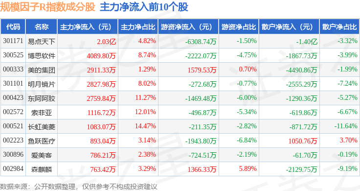 资金流向方面,规模因子R(480055)指数成份股当日主力资金净流出合计9.71亿元,游资资金净流入合计3.1亿元,散户资金净流入合计6.61亿元。成份股资金流向详情见下表: