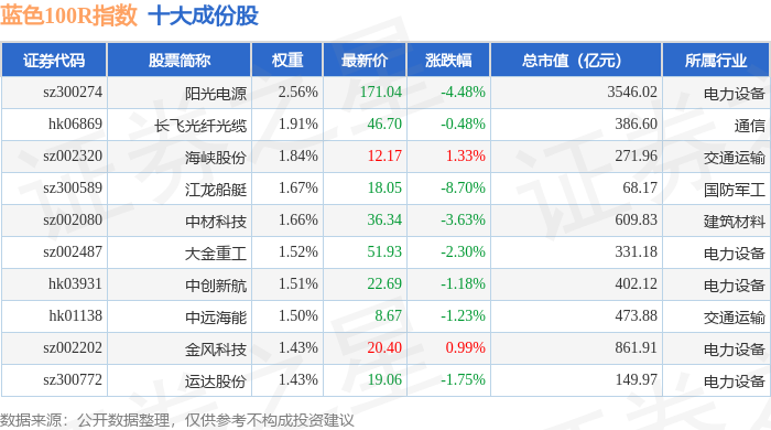蓝色100R(480068)指数十大成份股详情如下: