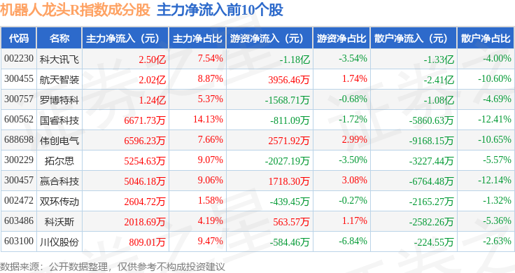 资金流向方面,机器人龙头R(480071)指数成份股当日主力资金净流出合计12.93亿元,游资资金净流入合计6.69亿元,散户资金净流入合计6.24亿元。成份股资金流向详情见下表: