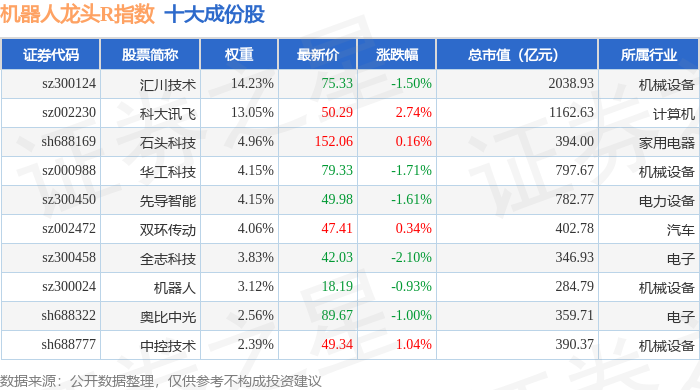证券之星消息,12月31日,机器人龙头R(480071)指数报收于2703.82点,跌0.17%,成交444.45亿元,换手率2.8%。当日该指数成份股中,上涨的有18家,精测电子以7.31%的涨幅领涨,下跌的有32家,伟创电气以4.51%的跌幅领跌。
