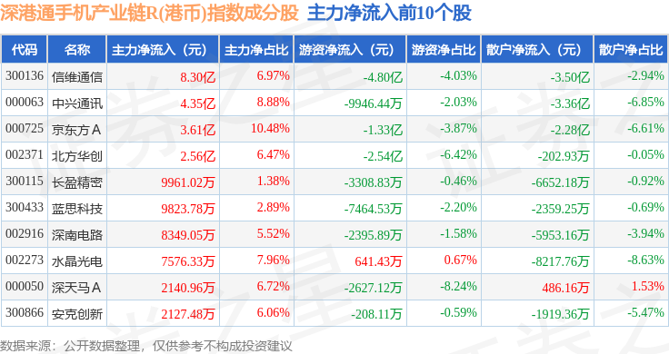 资金流向方面,深港通手机产业链R(港币)(483010)指数成份股当日主力资金净流出合计26.93亿元,游资资金净流入合计2.36亿元,散户资金净流入合计24.57亿元。成份股资金流向详情见下表:
