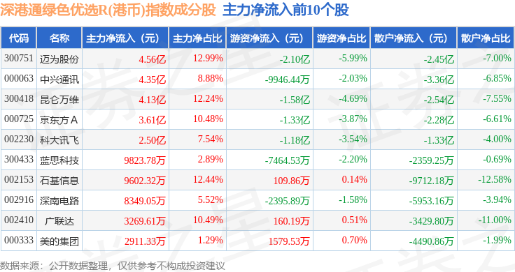 资金流向方面,深港通绿色优选R(港币)(483012)指数成份股当日主力资金净流入合计1.37亿元,游资资金净流出合计4.1亿元,散户资金净流入合计2.73亿元。成份股资金流向详情见下表: