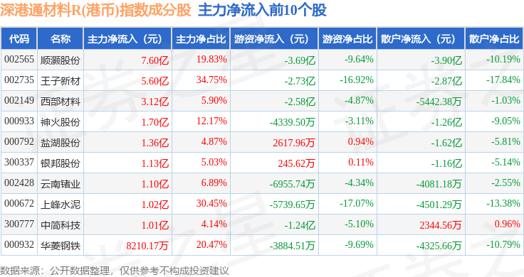 资金流向方面,深港通材料R(港币)(483016)指数成份股当日主力资金净流出合计39.66亿元,游资资金净流出合计6.75亿元,散户资金净流入合计46.41亿元。成份股资金流向详情见下表: