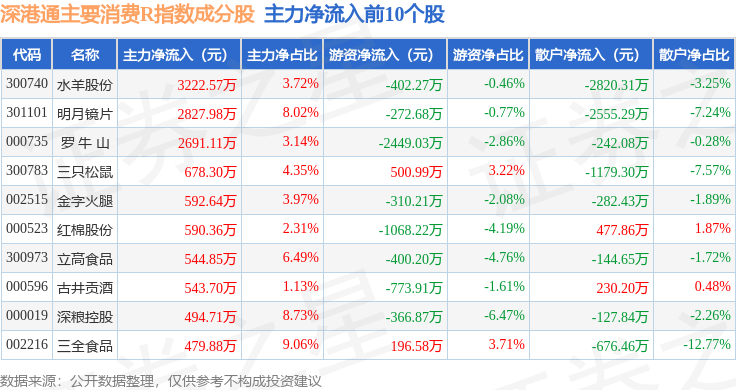 资金流向方面,深港通主要消费R(483021)指数成份股当日主力资金净流出合计14.64亿元,游资资金净流入合计3.58亿元,散户资金净流入合计11.06亿元。成份股资金流向详情见下表: