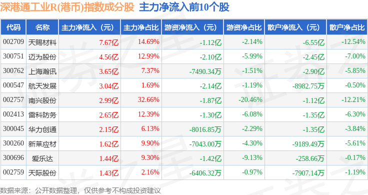 资金流向方面,深港通工业R(港币)(483018)指数成份股当日主力资金净流出合计83.75亿元,游资资金净流入合计10.3亿元,散户资金净流入合计73.45亿元。成份股资金流向详情见下表:
