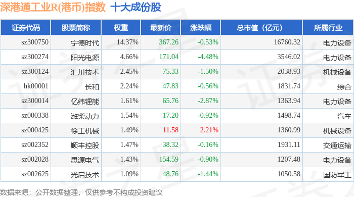 深港通工业R(港币)(483018)指数十大成份股详情如下: