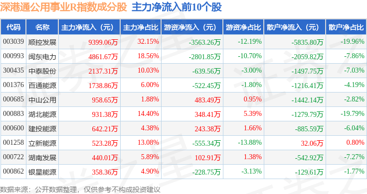 资金流向方面,深港通公用事业R(483031)指数成份股当日主力资金净流出合计7406.23万元,游资资金净流入合计820.72万元,散户资金净流入合计6585.51万元。成份股资金流向详情见下表: