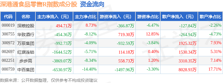 资金流向方面,深港通食品零售R(483037)指数成份股当日主力资金净流出合计1.3亿元,游资资金净流出合计1405.2万元,散户资金净流入合计1.44亿元。成份股资金流向详情见下表: