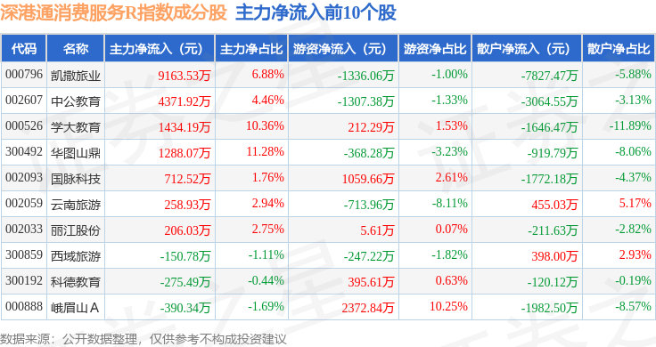 资金流向方面,深港通消费服务R(483045)指数成份股当日主力资金净流入合计4349.82万元,游资资金净流入合计3217.49万元,散户资金净流出合计7567.31万元。成份股资金流向详情见下表: