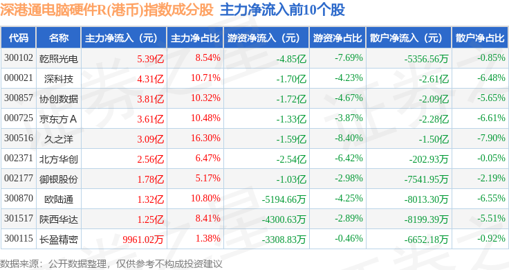 资金流向方面,深港通电脑硬件R(港币)(483044)指数成份股当日主力资金净流出合计46.42亿元,游资资金净流出合计1.19亿元,散户资金净流入合计47.61亿元。成份股资金流向详情见下表: