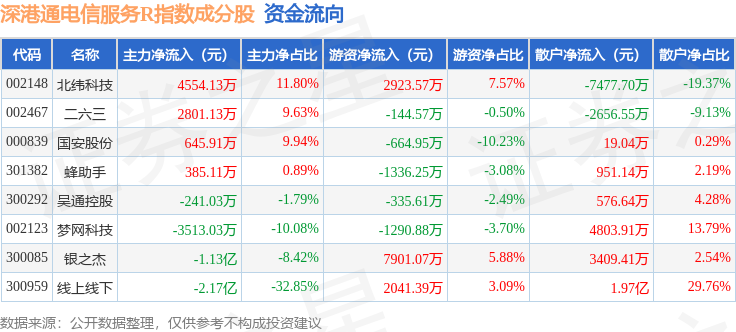 资金流向方面,深港通电信服务R(483057)指数成份股当日主力资金净流出合计2.84亿元,游资资金净流入合计9093.77万元,散户资金净流入合计1.93亿元。成份股资金流向详情见下表: