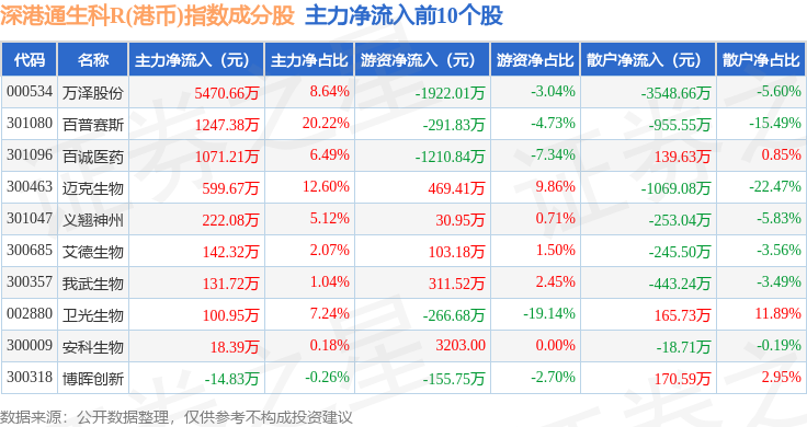 资金流向方面,深港通生科R(港币)(483060)指数成份股当日主力资金净流出合计3.51亿元,游资资金净流入合计7595.24万元,散户资金净流入合计2.75亿元。成份股资金流向详情见下表: