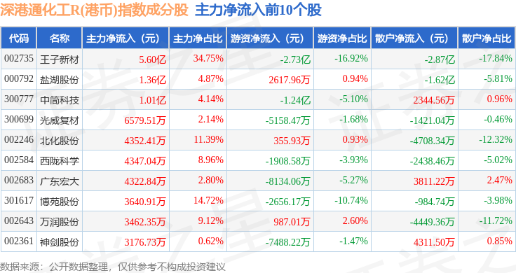 资金流向方面,深港通化工R(港币)(483064)指数成份股当日主力资金净流出合计10.06亿元,游资资金净流出合计2.07亿元,散户资金净流入合计12.12亿元。成份股资金流向详情见下表: