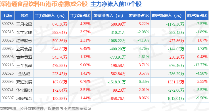资金流向方面,深港通食品饮料R(港币)(483066)指数成份股当日主力资金净流出合计8.52亿元,游资资金净流入合计1.47亿元,散户资金净流入合计7.05亿元。成份股资金流向详情见下表: