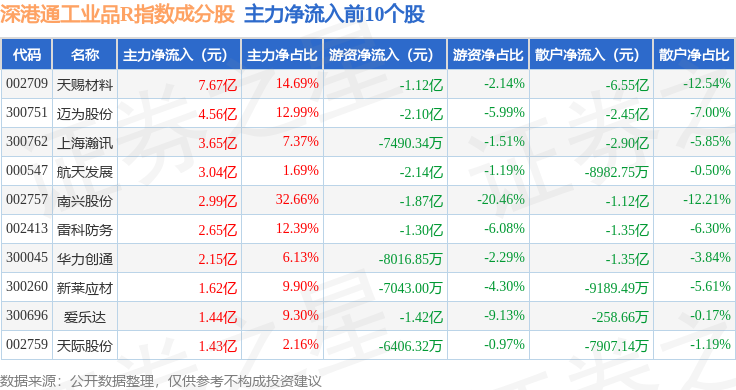 资金流向方面,深港通工业品R(483069)指数成份股当日主力资金净流出合计76.15亿元,游资资金净流入合计10.01亿元,散户资金净流入合计66.14亿元。成份股资金流向详情见下表: