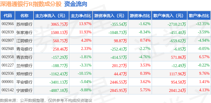 资金流向方面,深港通银行R(483081)指数成份股当日主力资金净流出合计4411.71万元,游资资金净流入合计3565.85万元,散户资金净流入合计845.87万元。成份股资金流向详情见下表: