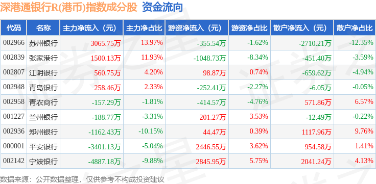 资金流向方面,深港通银行R(港币)(483082)指数成份股当日主力资金净流出合计4411.71万元,游资资金净流入合计3565.85万元,散户资金净流入合计845.87万元。成份股资金流向详情见下表: