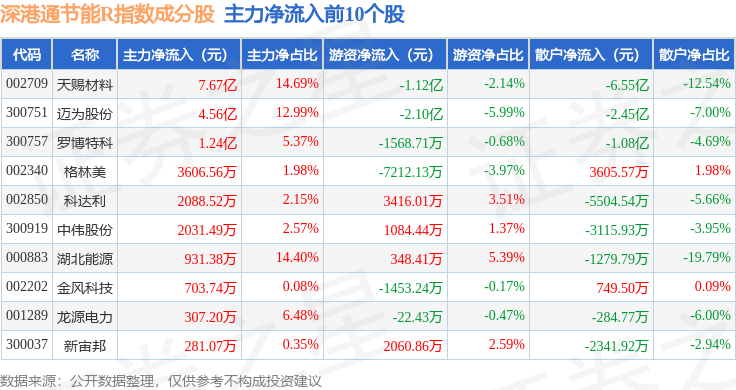 资金流向方面,深港通节能R(483085)指数成份股当日主力资金净流出合计37.3亿元,游资资金净流入合计9.81亿元,散户资金净流入合计27.48亿元。成份股资金流向详情见下表: