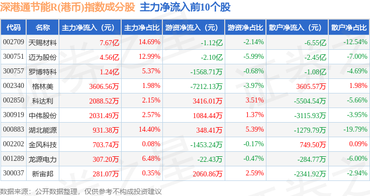 资金流向方面,深港通节能R(港币)(483086)指数成份股当日主力资金净流出合计37.3亿元,游资资金净流入合计9.81亿元,散户资金净流入合计27.48亿元。成份股资金流向详情见下表:
