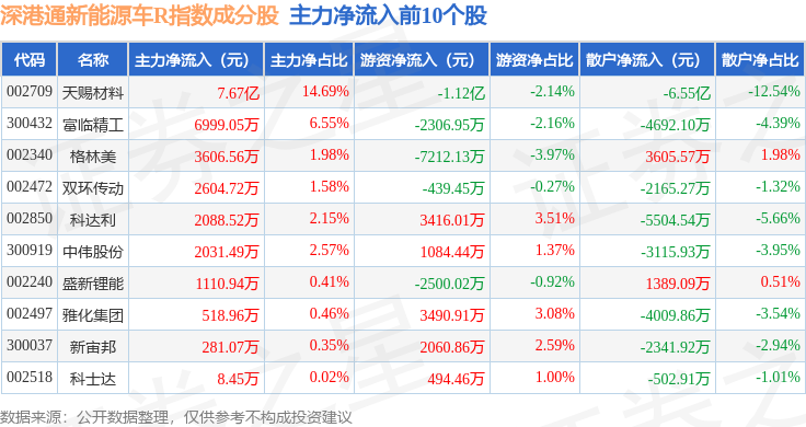 资金流向方面,深港通新能源车R(483087)指数成份股当日主力资金净流出合计43.49亿元,游资资金净流入合计9.18亿元,散户资金净流入合计34.32亿元。成份股资金流向详情见下表: