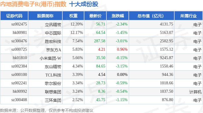 内地消费电子R(港币)(483106)指数十大成份股详情如下:
