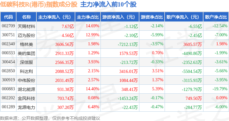 资金流向方面,低碳科技R(港币)(483161)指数成份股当日主力资金净流出合计49.26亿元,游资资金净流入合计14.64亿元,散户资金净流入合计34.62亿元。成份股资金流向详情见下表: