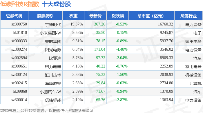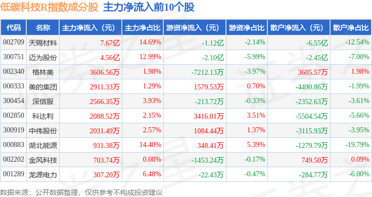 资金流向方面,低碳科技R(483160)指数成份股当日主力资金净流出合计49.26亿元,游资资金净流入合计14.64亿元,散户资金净流入合计34.62亿元。成份股资金流向详情见下表:
