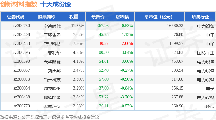 创新材料(970039)指数十大成份股详情如下: