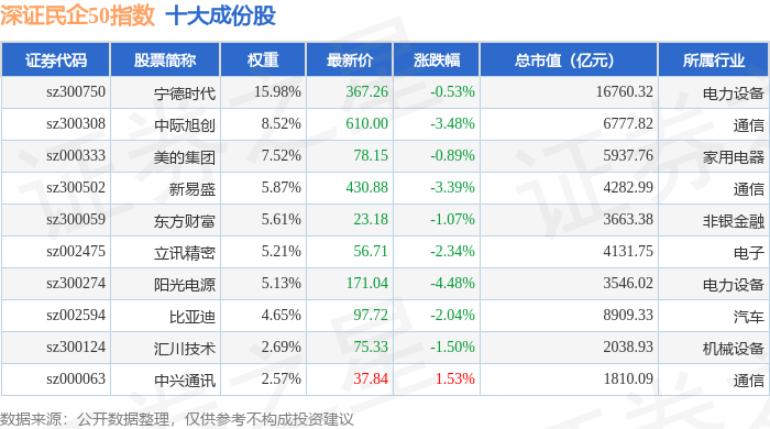 深证民企50(970057)指数十大成份股详情如下: