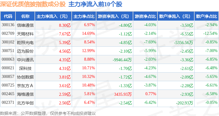 资金流向方面,深证优质信披(970065)指数成份股当日主力资金净流出合计125.84亿元,游资资金净流入合计41.04亿元,散户资金净流入合计84.8亿元。成份股资金流向详情见下表: