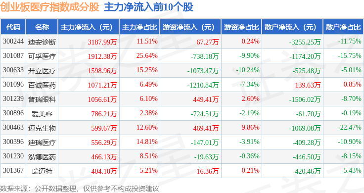 资金流向方面,创业板医疗(970082)指数成份股当日主力资金净流出合计6.15亿元,游资资金净流入合计2.3亿元,散户资金净流入合计3.85亿元。成份股资金流向详情见下表: