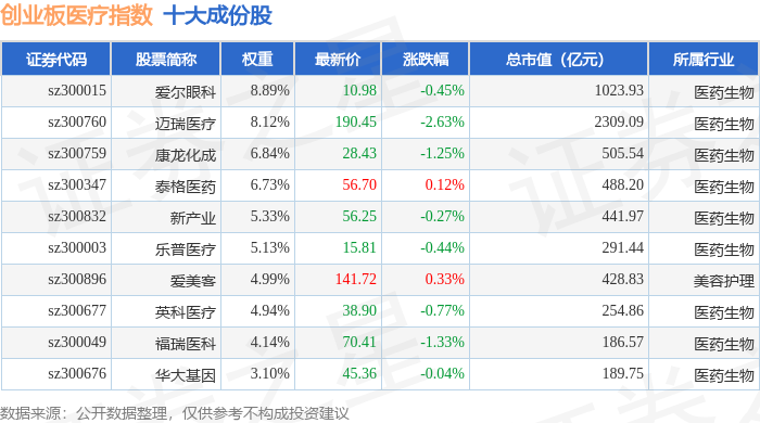 创业板医疗(970082)指数十大成份股详情如下: