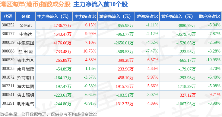 资金流向方面,湾区海洋(港币)(980020)指数成份股当日主力资金净流出合计1118.56万元,游资资金净流出合计8029.51万元,散户资金净流入合计9148.06万元。成份股资金流向详情见下表: