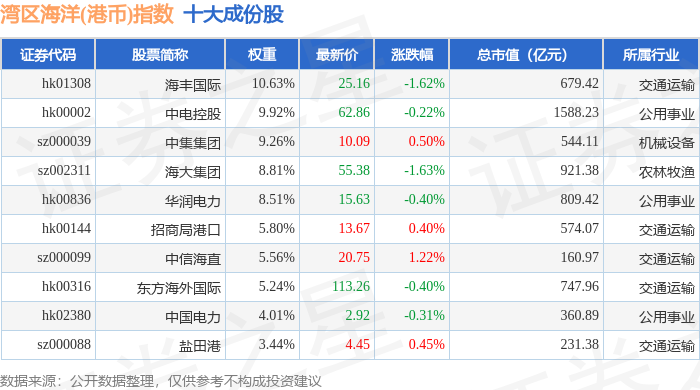 湾区海洋(港币)(980020)指数十大成份股详情如下: