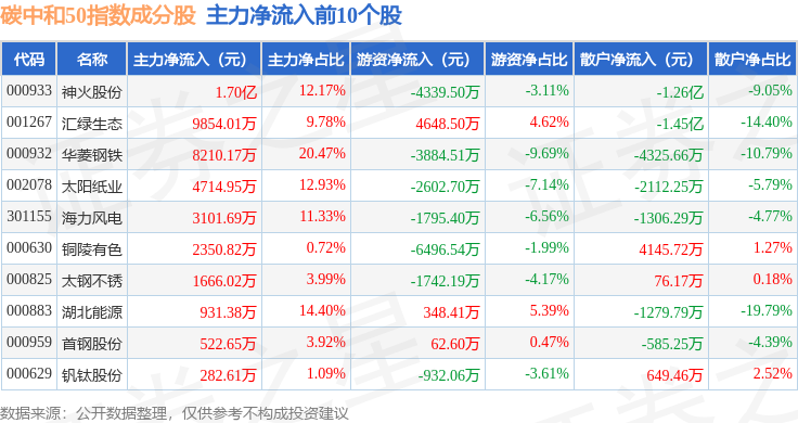 资金流向方面,碳中和50(980021)指数成份股当日主力资金净流出合计18.64亿元,游资资金净流入合计3.69亿元,散户资金净流入合计14.94亿元。成份股资金流向详情见下表: