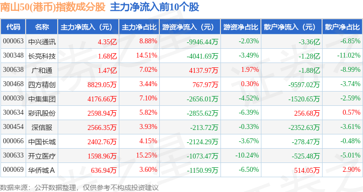 资金流向方面,南山50(港币)(980024)指数成份股当日主力资金净流出合计7.08亿元,游资资金净流入合计1.13亿元,散户资金净流入合计5.95亿元。成份股资金流向详情见下表: