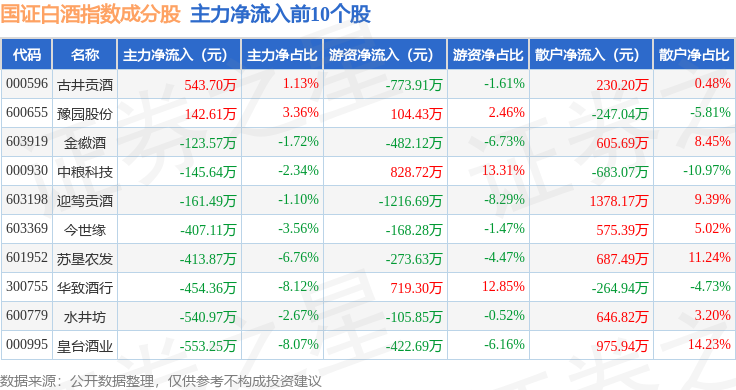 资金流向方面,国证白酒(980031)指数成份股当日主力资金净流出合计16.71亿元,游资资金净流入合计8.99亿元,散户资金净流入合计7.73亿元。成份股资金流向详情见下表: