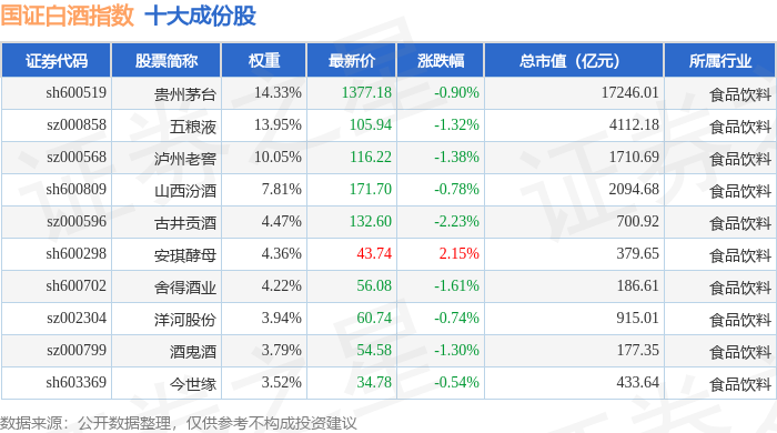 国证白酒(980031)指数十大成份股详情如下: