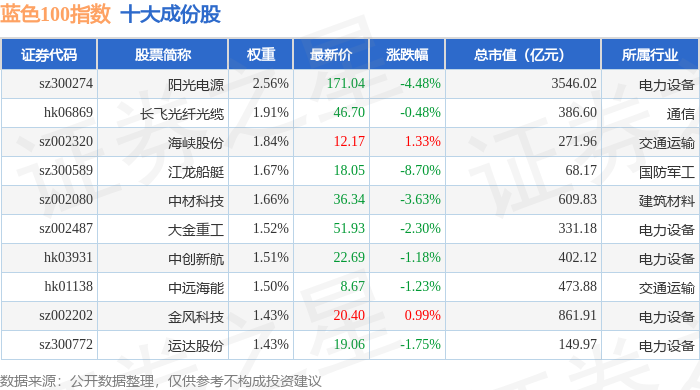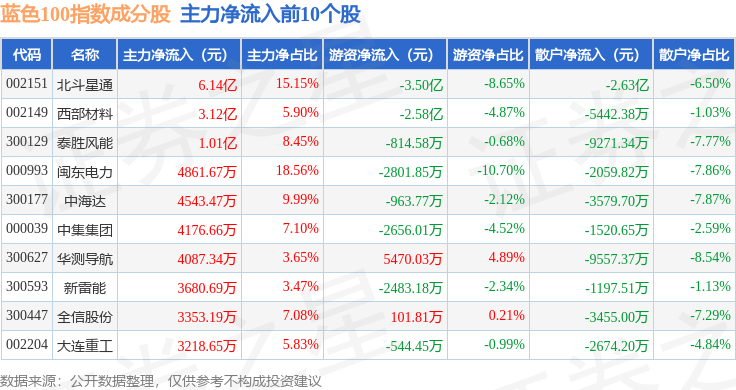 资金流向方面,蓝色100(980068)指数成份股当日主力资金净流出合计13.88亿元,游资资金净流入合计1255.84万元,散户资金净流入合计13.75亿元。成份股资金流向详情见下表: