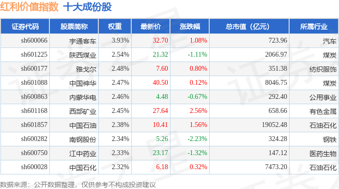 证券之星消息,12月31日,红利价值(980103)指数报收于3221.62点,涨0.11%,成交280.91亿元,换手率0.33%。当日该指数成份股中,上涨的有24家,嘉化能源以3.68%的涨幅领涨,下跌的有25家,南钢股份以2.23%的跌幅领跌。