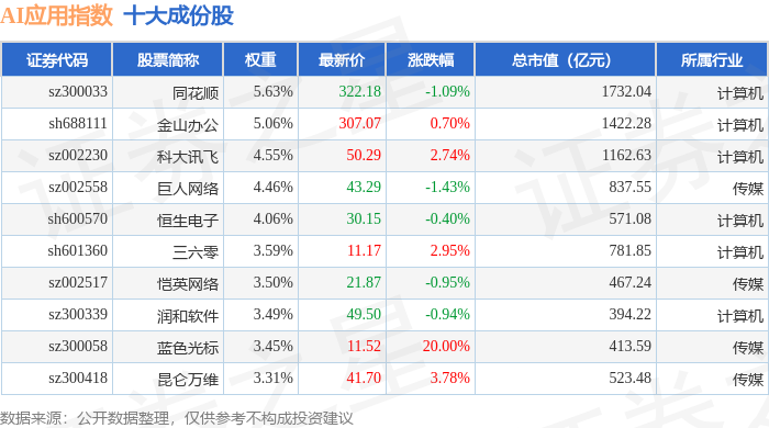 证券之星消息,12月31日,AI应用(980112)指数报收于1688.91点,涨1.09%,成交562.49亿元,换手率4.29%。当日该指数成份股中,上涨的有30家,蓝色光标以20.0%的涨幅领涨,下跌的有19家,拓维信息以3.13%的跌幅领跌。