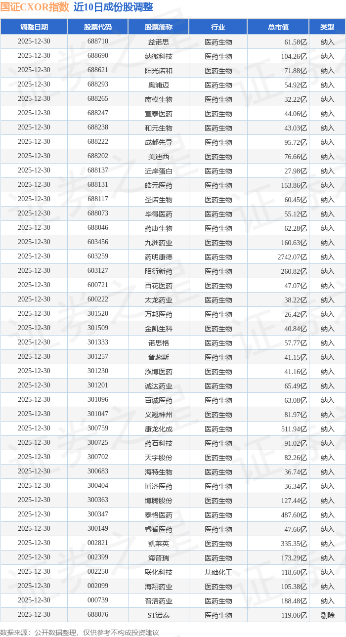 近10日内国证CXOR(98012001)指数成份股做了调整,新纳入了40只股票,剔除了1只股票。