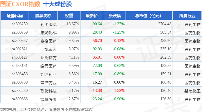 证券之星消息,12月31日,国证CXOR(98012001)指数报收于1789.94点,跌0.63%,成交90.21亿元,换手率1.54%。当日该指数成份股中,上涨的有12家,奥浦迈以1.55%的涨幅领涨,下跌的有26家,海翔药业以4.15%的跌幅领跌。
