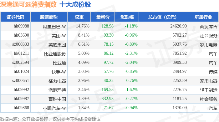证券之星消息,12月31日,深港通可选消费(983019)指数报收于5612.9点,跌0.34%,成交1941.1亿元,换手率2.56%。当日该指数成份股中,上涨的有165家,蓝色光标以20.0%的涨幅领涨,下跌的有172家,飞龙股份以7.36%的跌幅领跌。